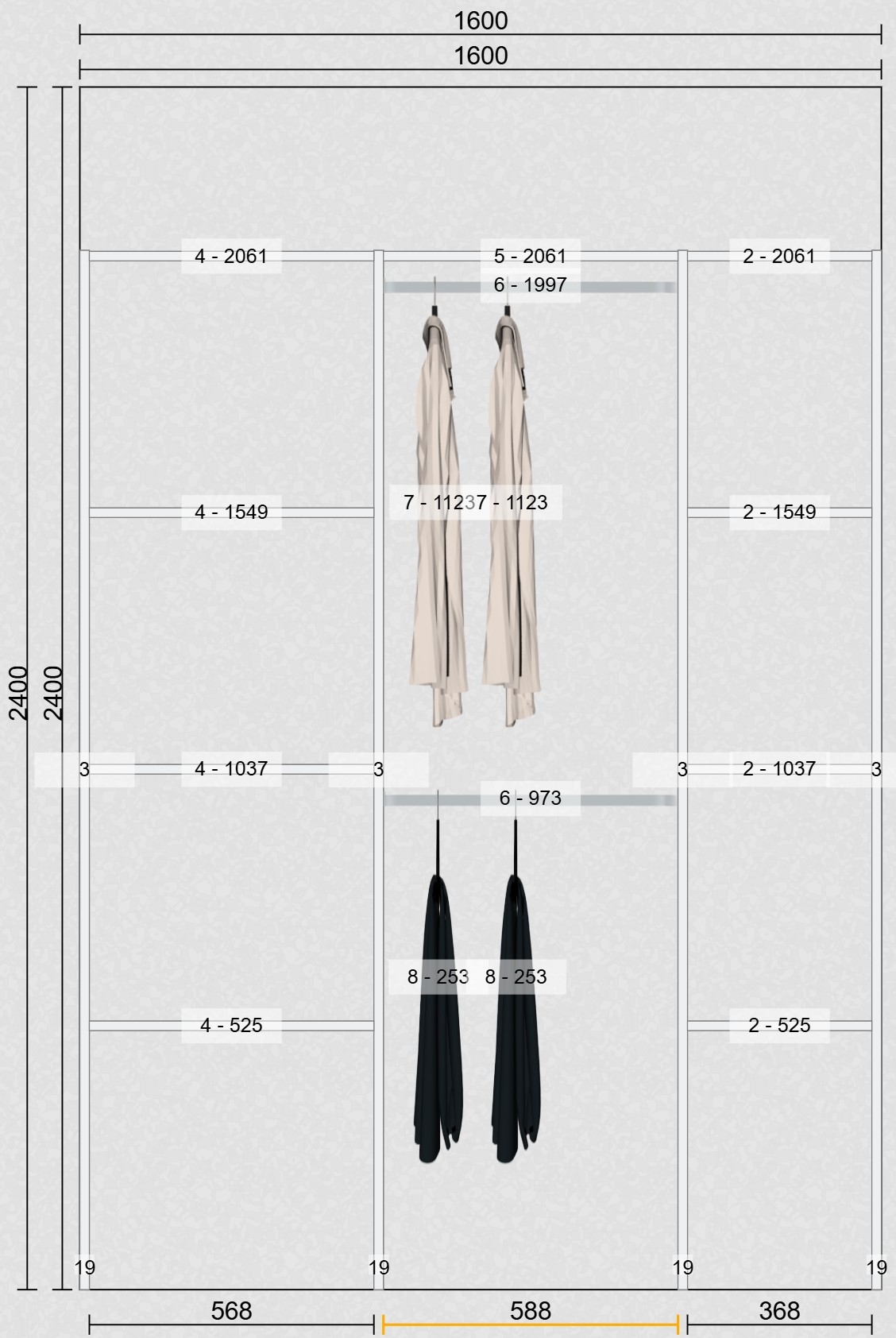 OBS: Inventar er uden bagbeklædning / inventar har standard højde på 207,4 cm. 50,5 cm. dybde