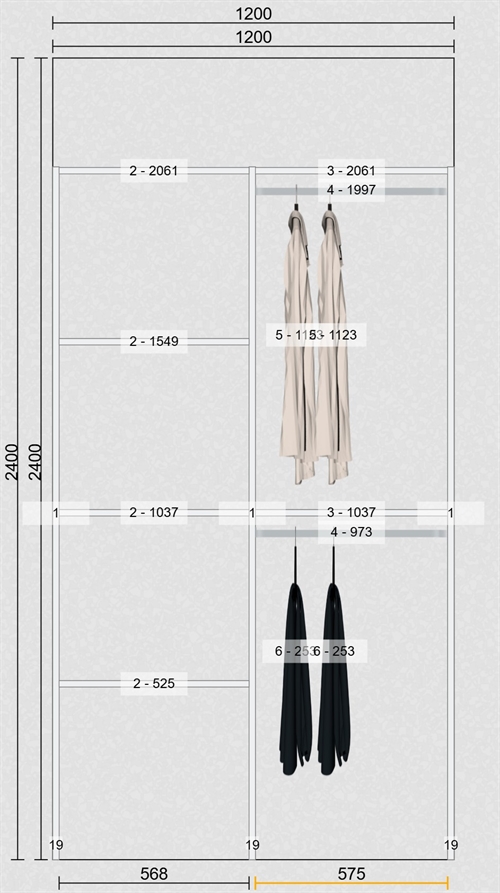 OBS: Inventar er uden bagbeklædning / inventar har standard højde på 207,4 cm. 50,5 cm. dybde