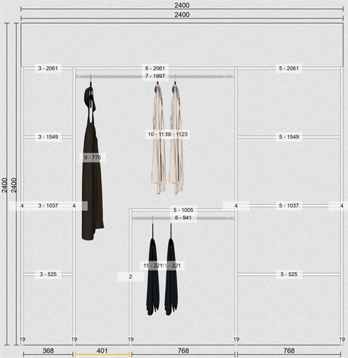 Celebert Inventar fra bredde 240 til 260 cm passer til 3 skydedøre