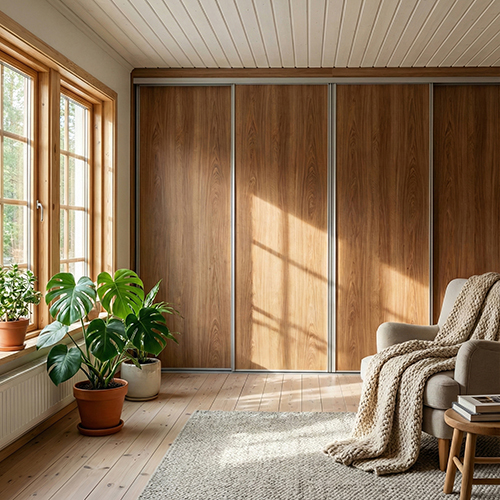 Denne type skydedør er opbygget af en ramme af enten alu-profiler i forskellig bredde og udførelse, MDF-fiberramme. Det er en skydelåge med en fyldning hvor du kan vælg mellem utallige farver og materialer og der er mulighed for Soft-close og påklæbede sprosser. Døre udmærker sig ved, at fyldningen kan varieres i farver samt kombinere forskellige typer af materialer, og dermed gøre skydedøre til en aktiv del af rummets design.