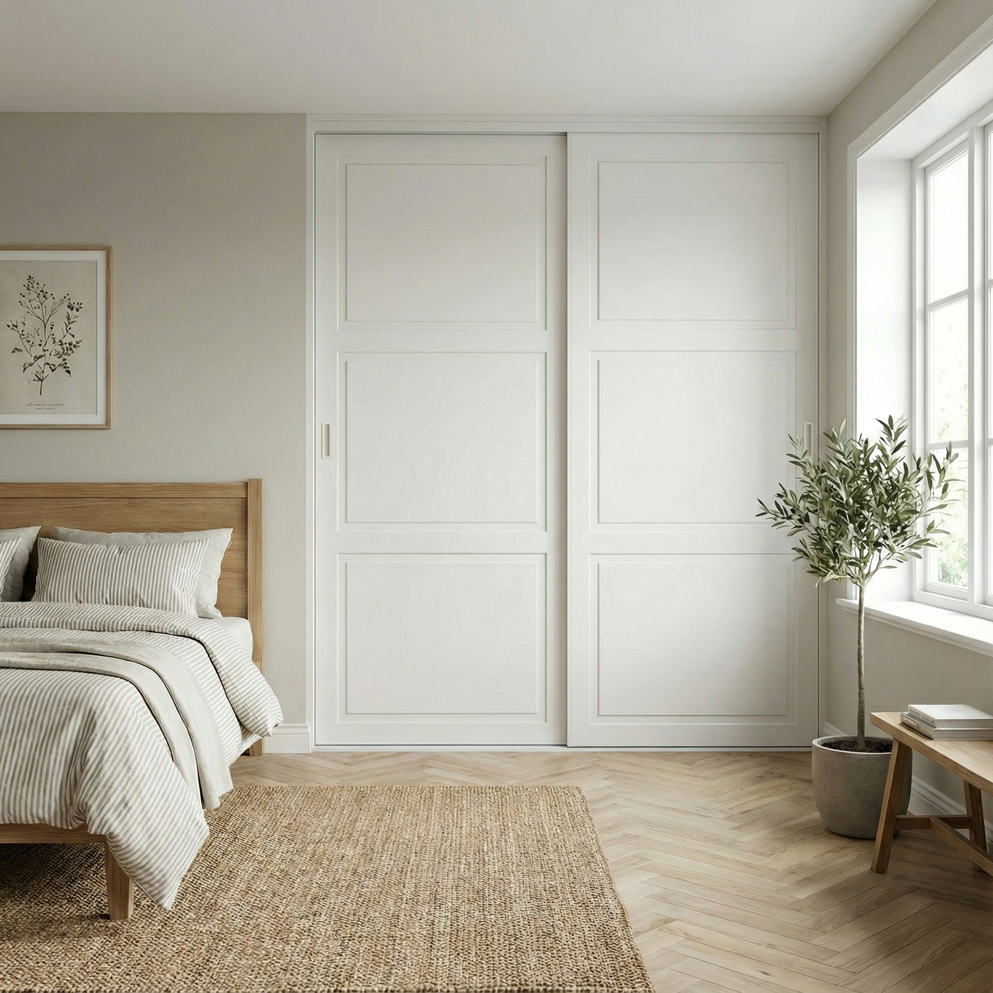 Mogensen Contoura Almue Folie skydelåger på mål til garderobe med 2 låger og softclose - Total bredde 131 til 155 cm.