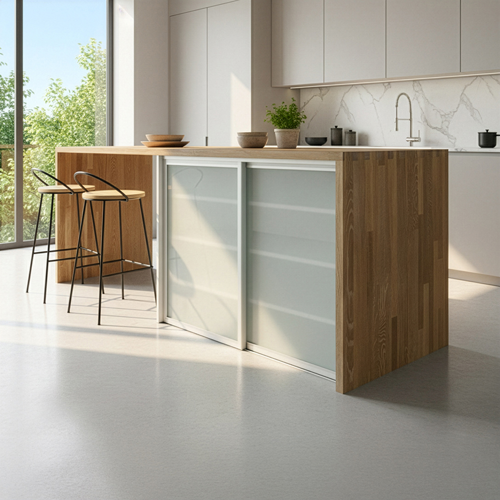 3 skydelåger fra bredde 193 - 231cm. Prisen er inklusiv skinnesæt og beslagskasse.