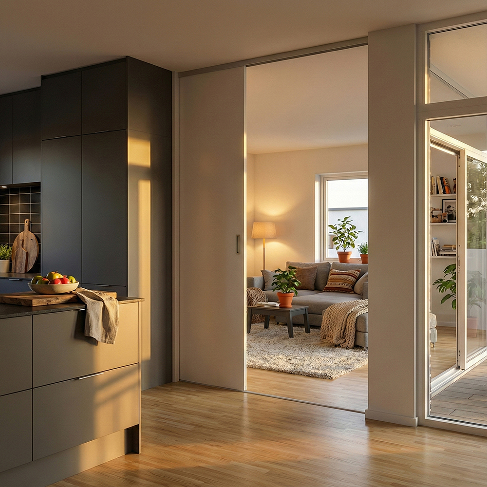 Elegant, glat skydedør fra gulv til loft