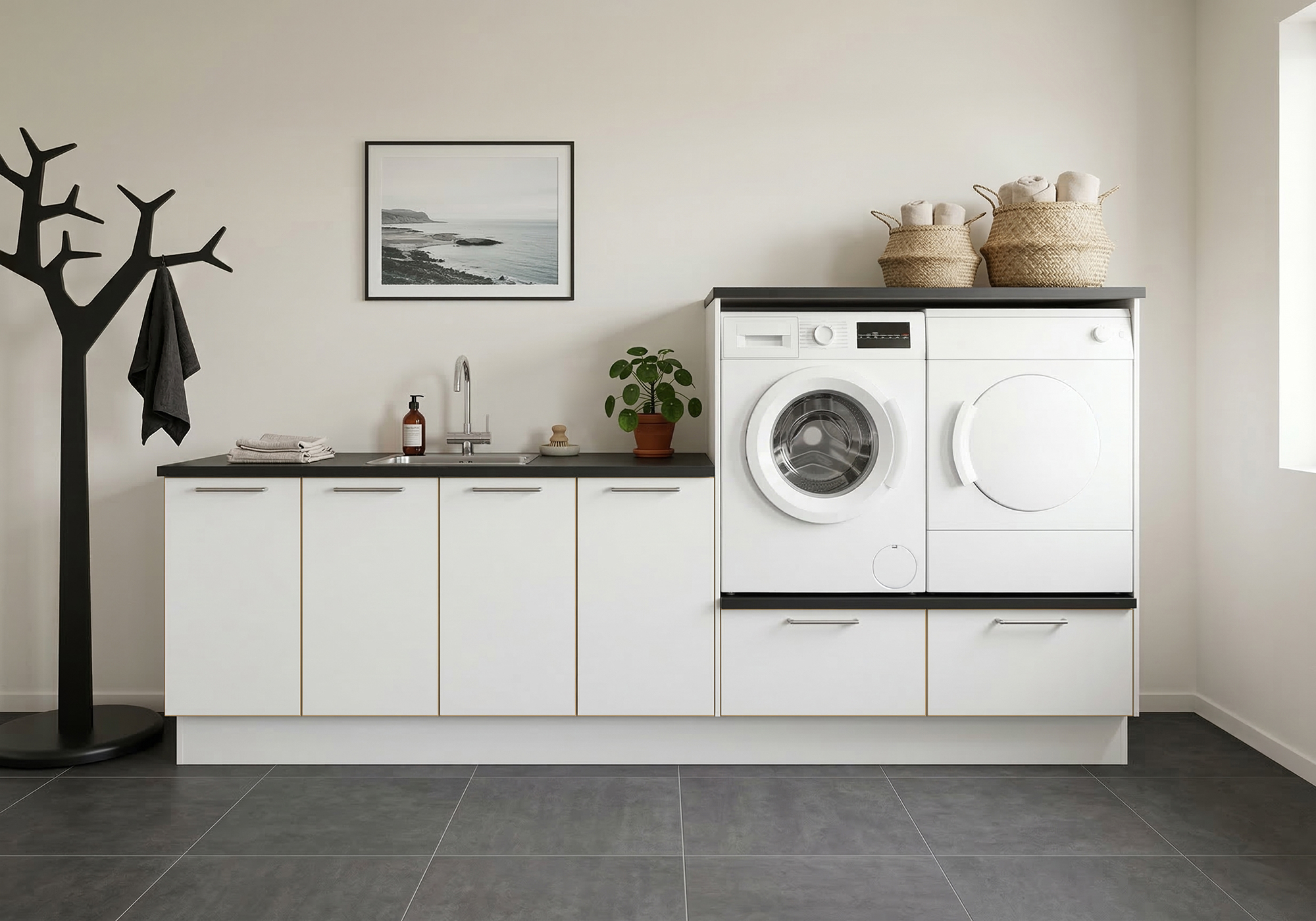 Multi-Living Bryggers sæt med White/Oak Line | Underskab m. skuffe, Vaskeskab, Gavle, Sokkelsæt - Bryggers sæt 1